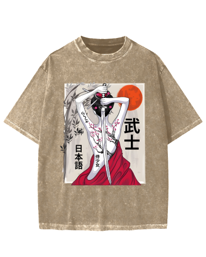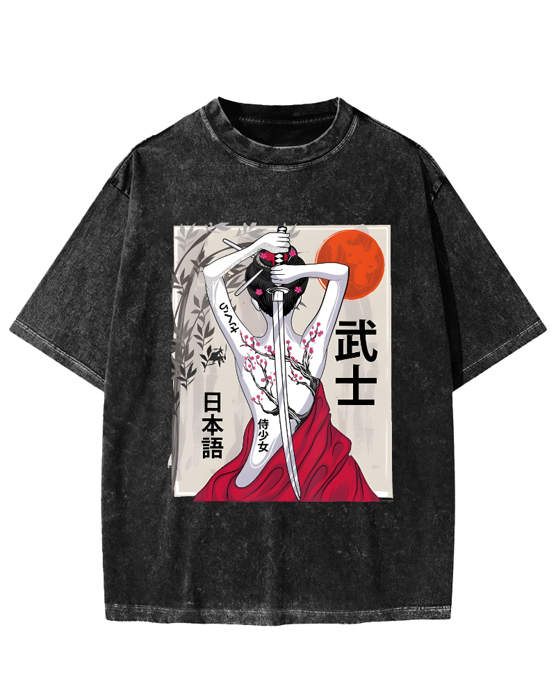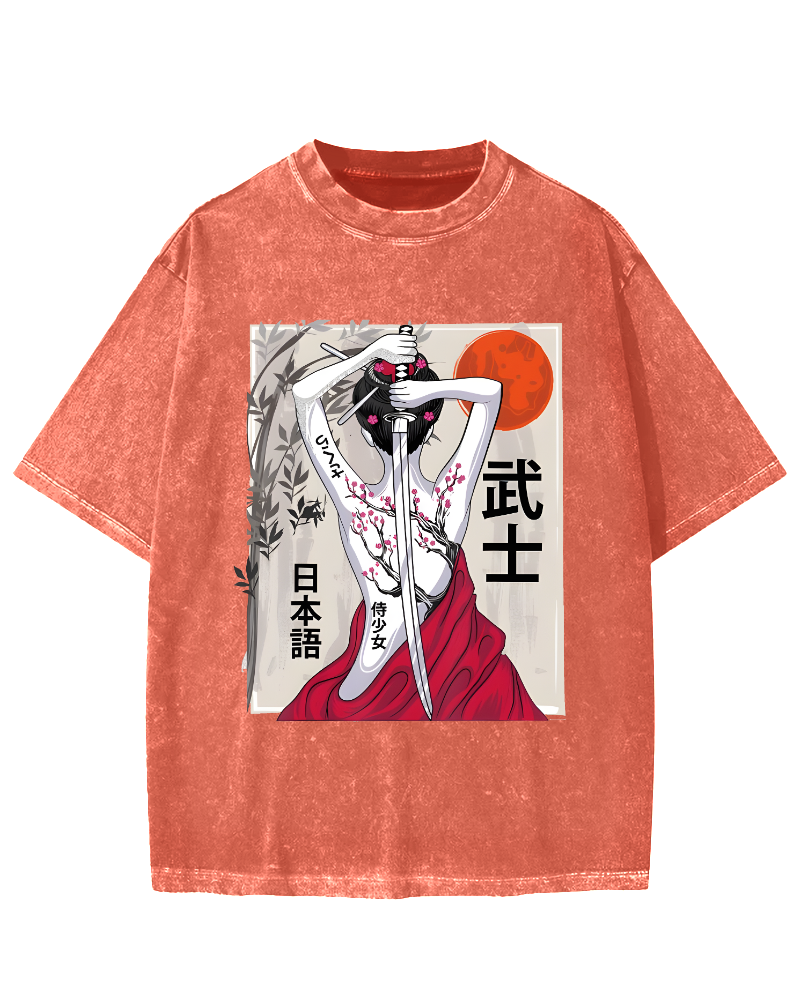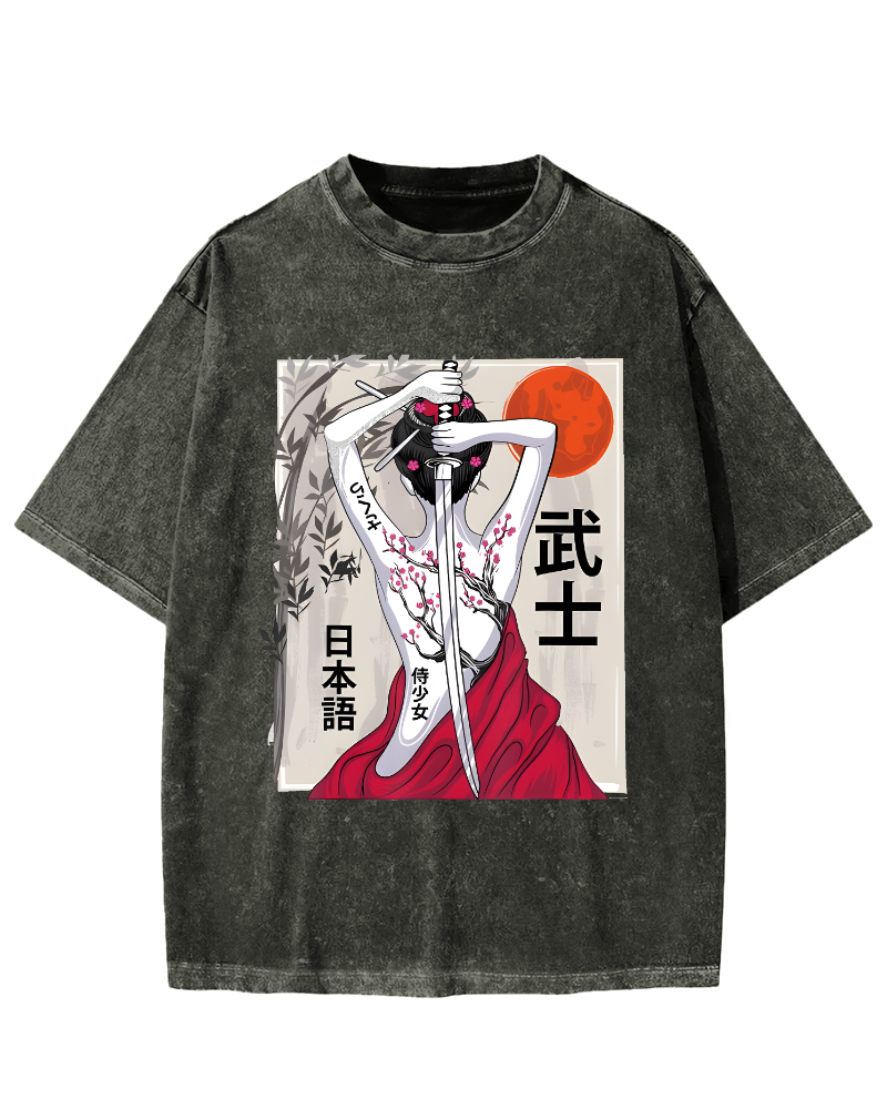 Japanese Samurai Girl Scenery Vintage Sakura Vintage Washed T-shirt