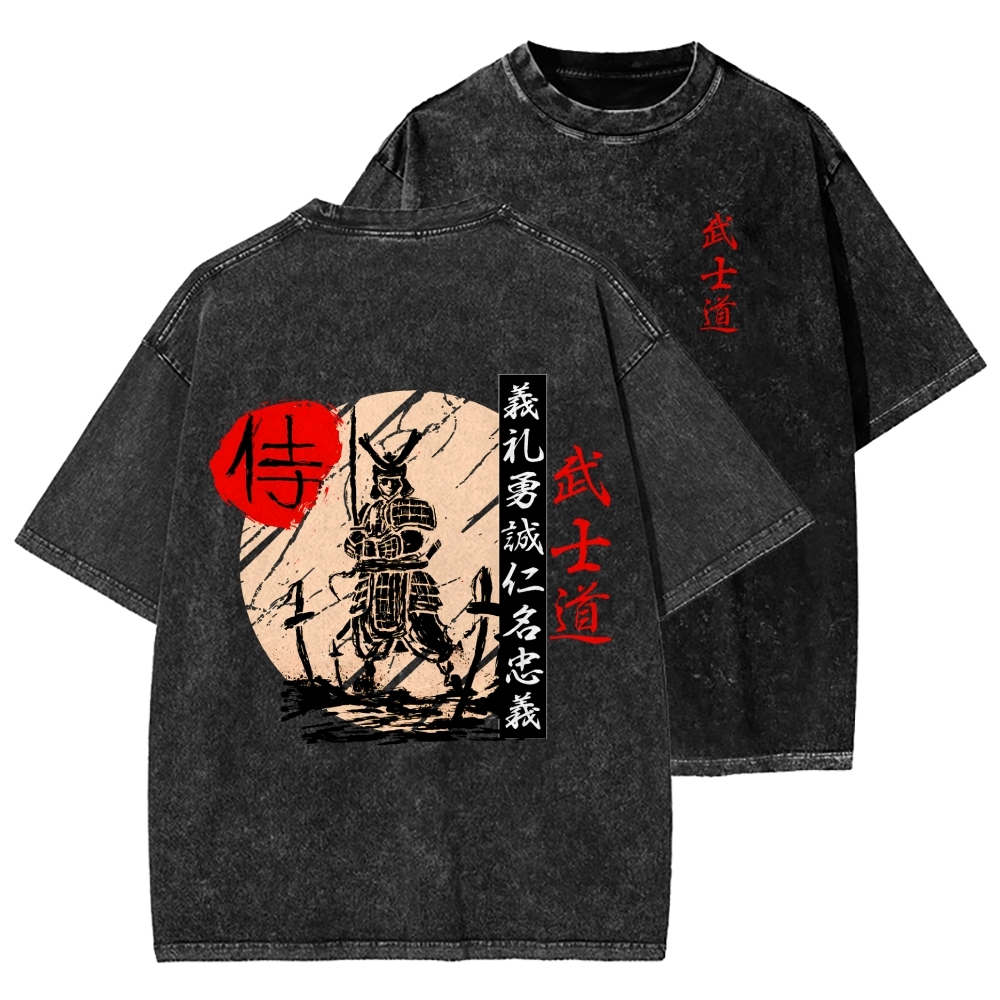 Japanese Samurai Warrior Bushido kanji Front And Back Printing Washed T-shirt