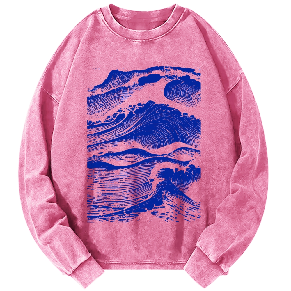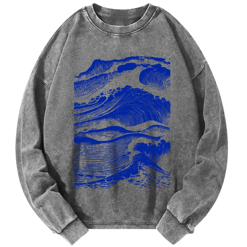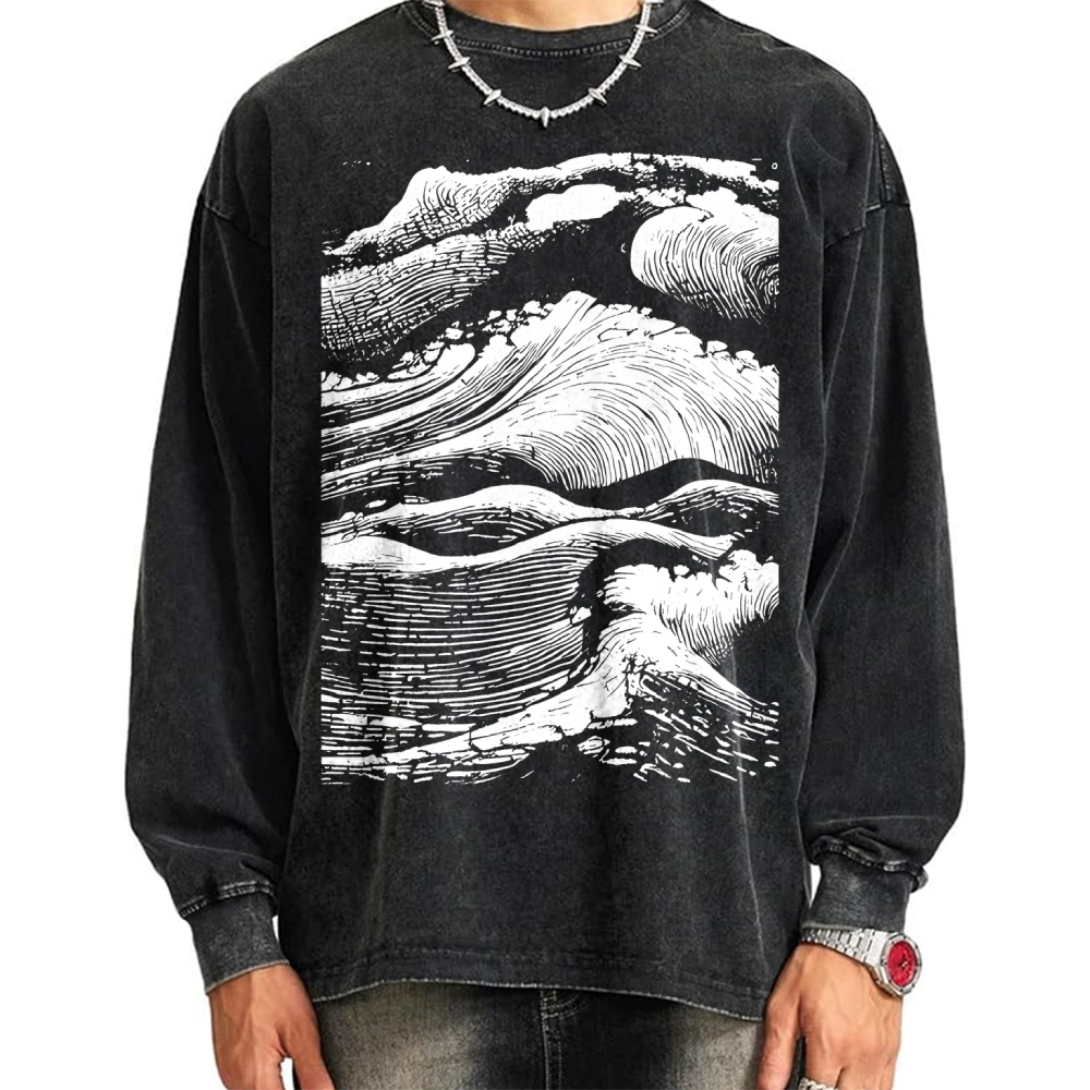 Japanese Wave Printed Vintage Washed Sweatshirts