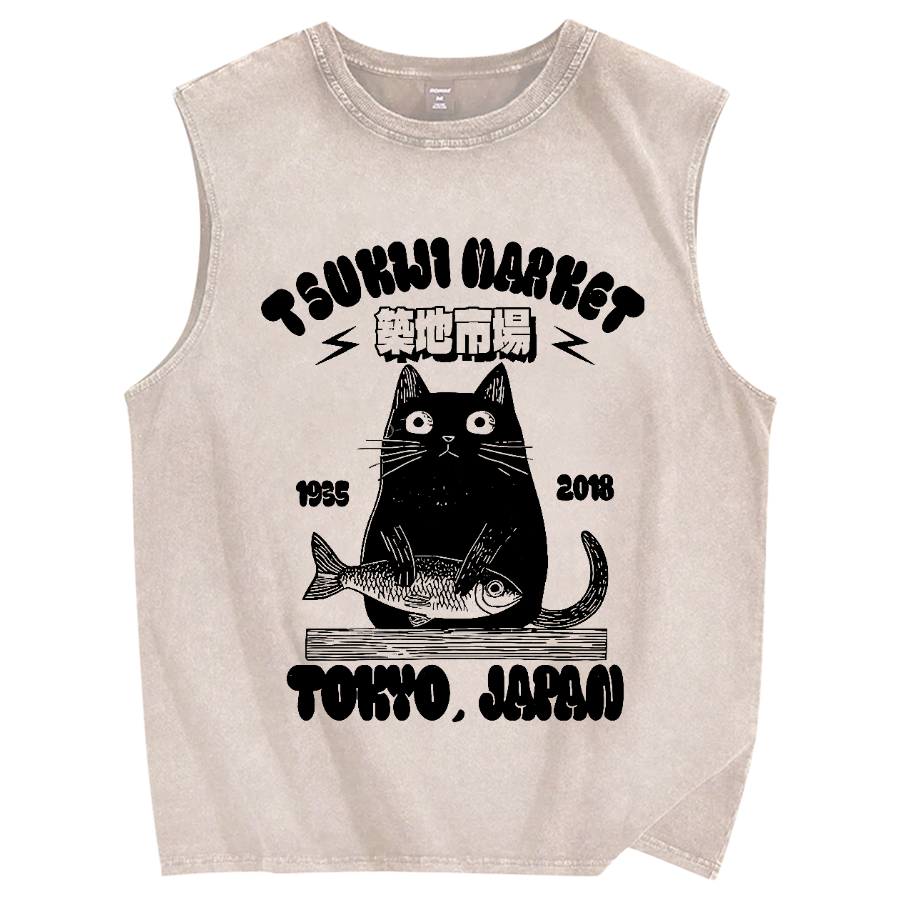 Tsukiji Market Cat Japan Vintage Distressed Washed Tank Top