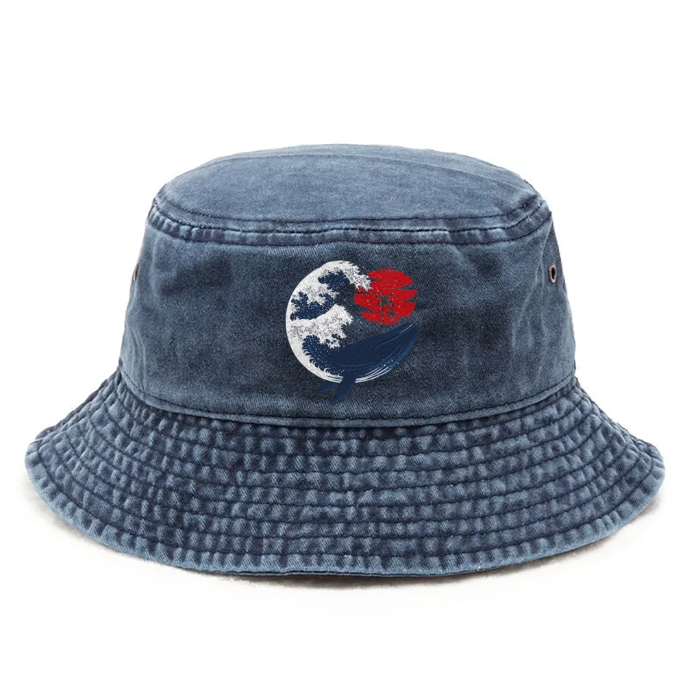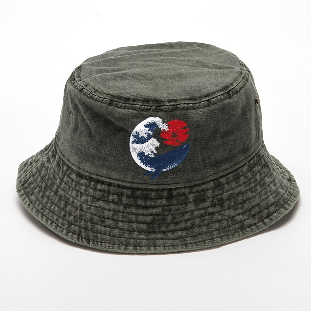 Whale Waves & Red Sun Japanese style Bucket Hat