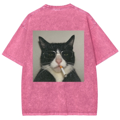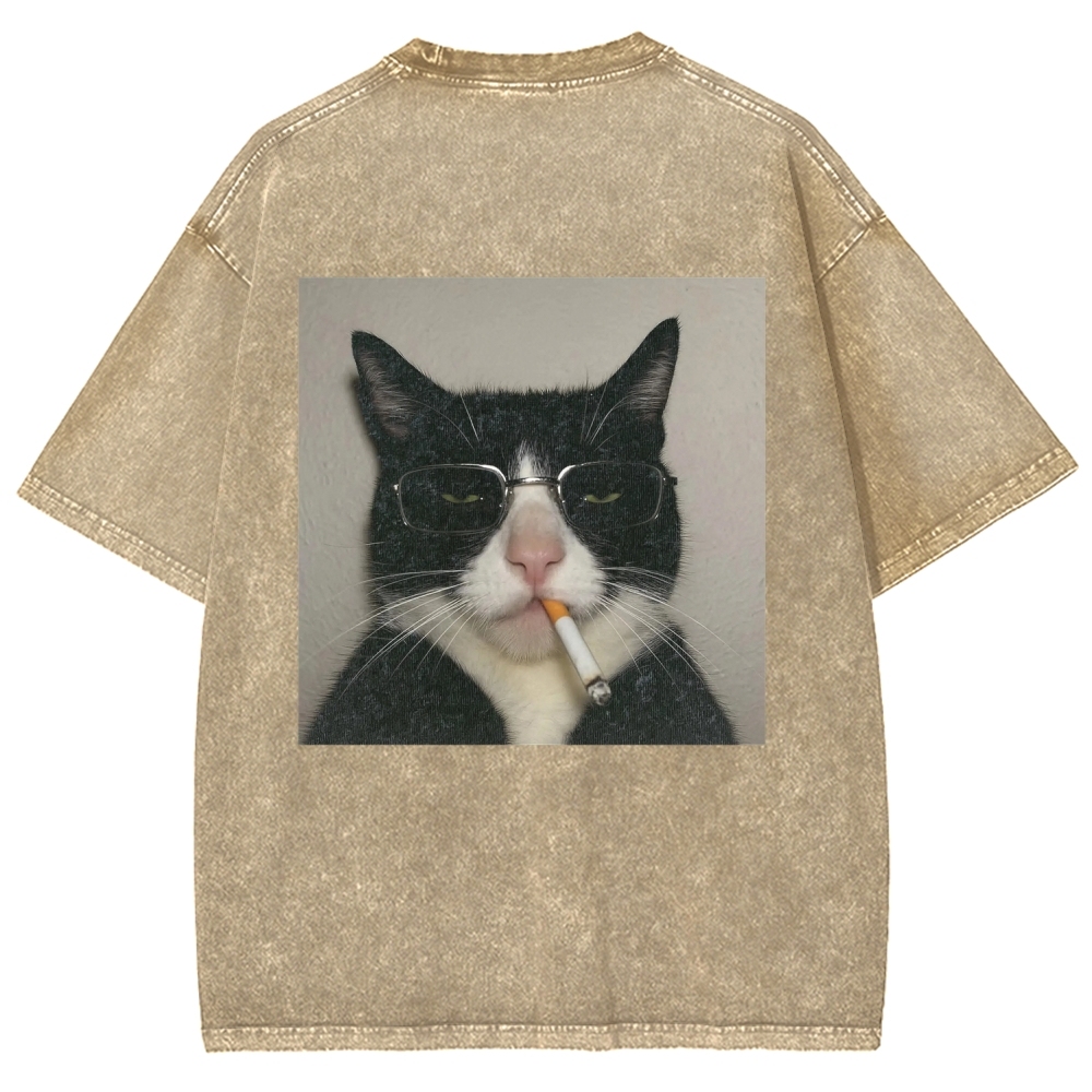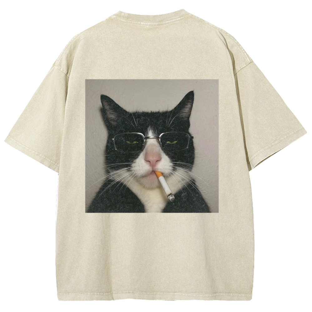 Cool Smoking Cat Back printing Vintage Washed T-shirt