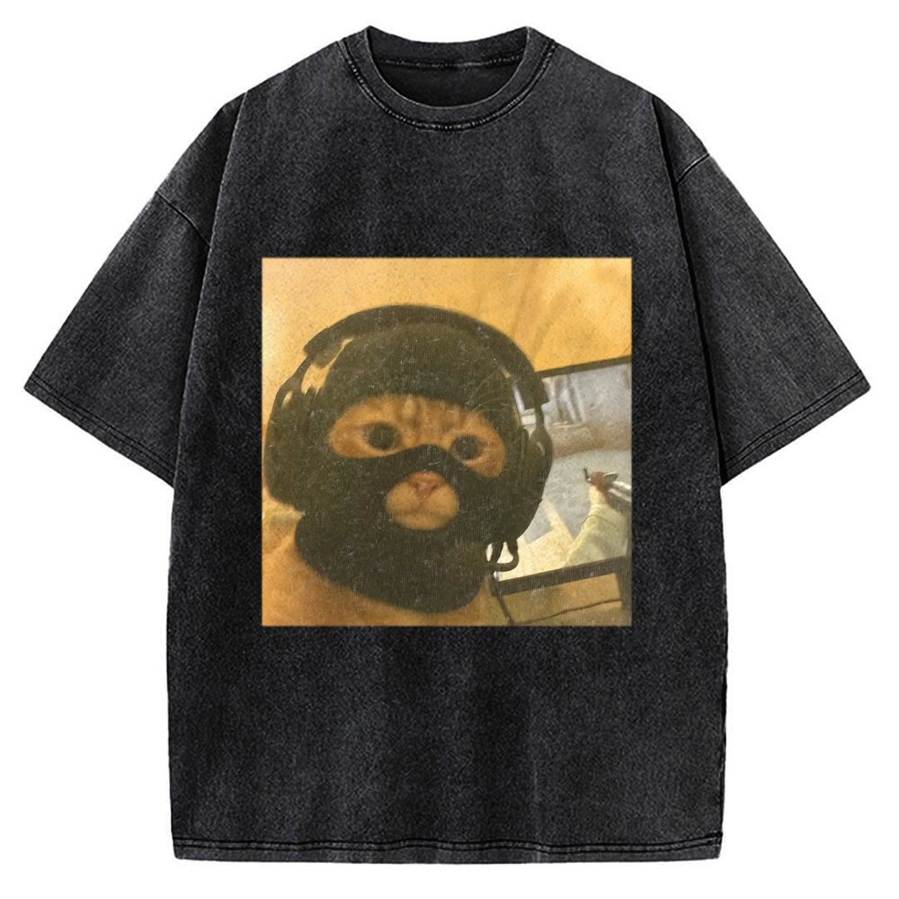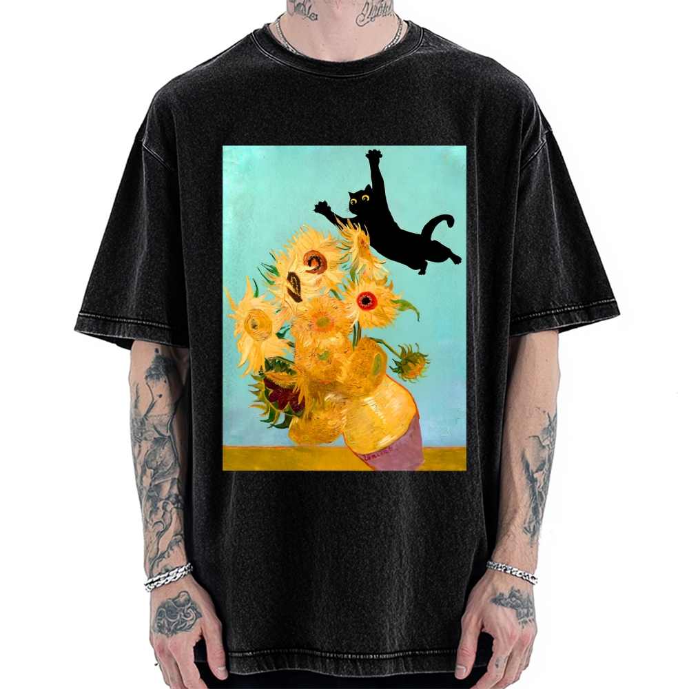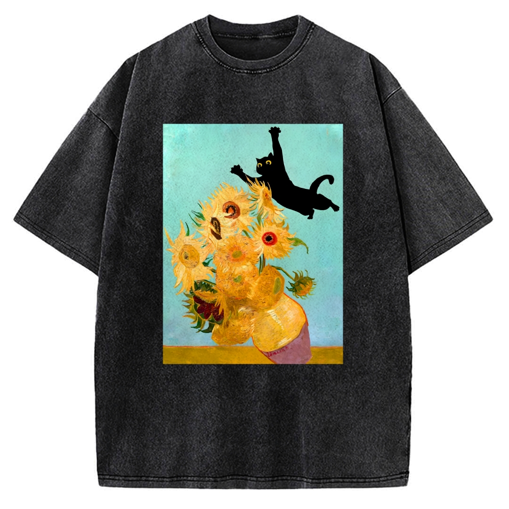 A Black Cat Accidentally Enters Van Gogh's Sunflower Painting. Vintage Washed T-shirt