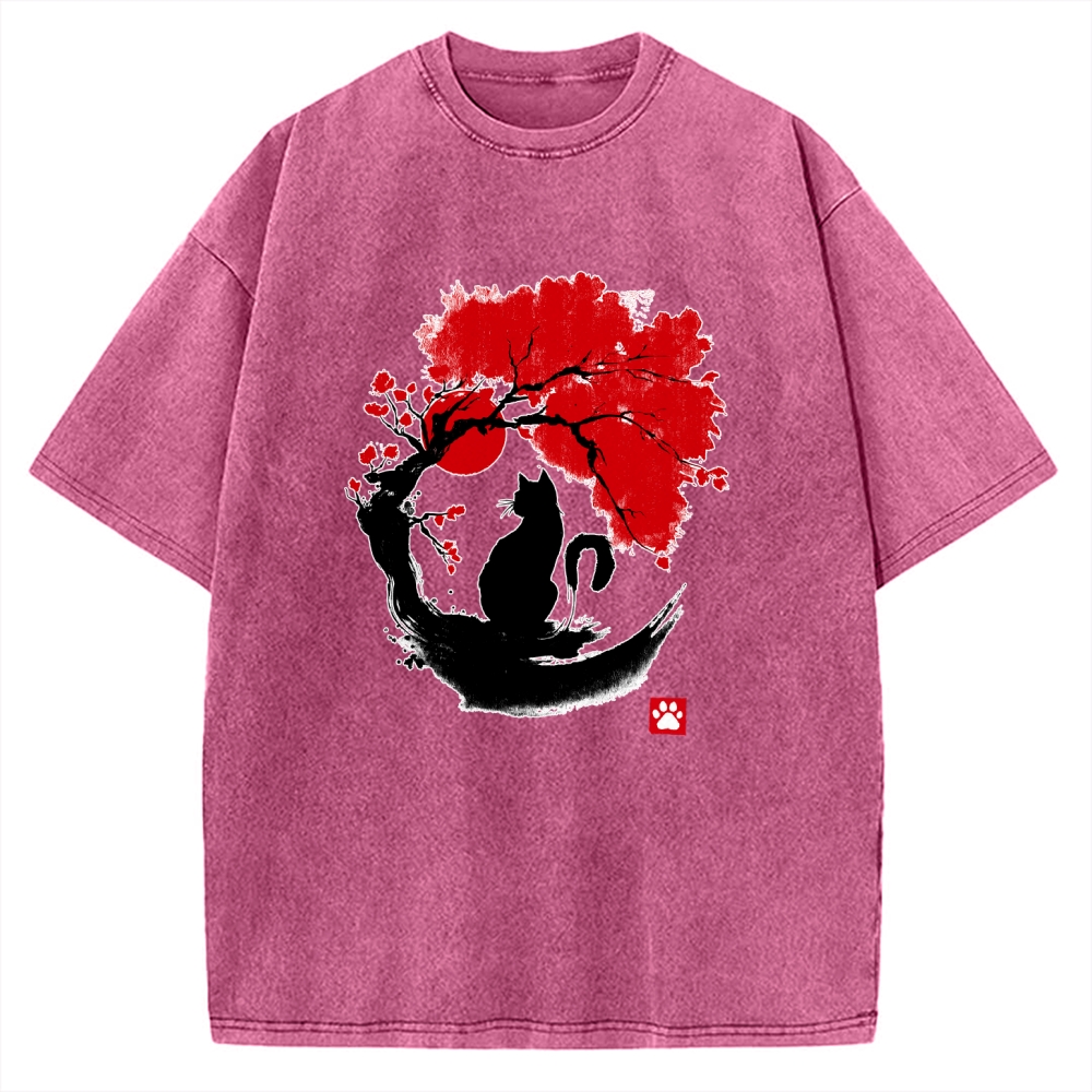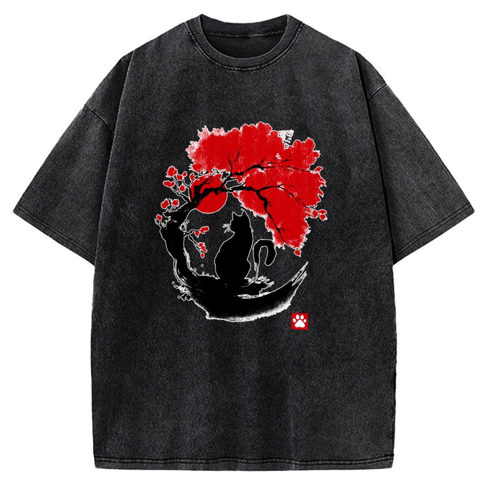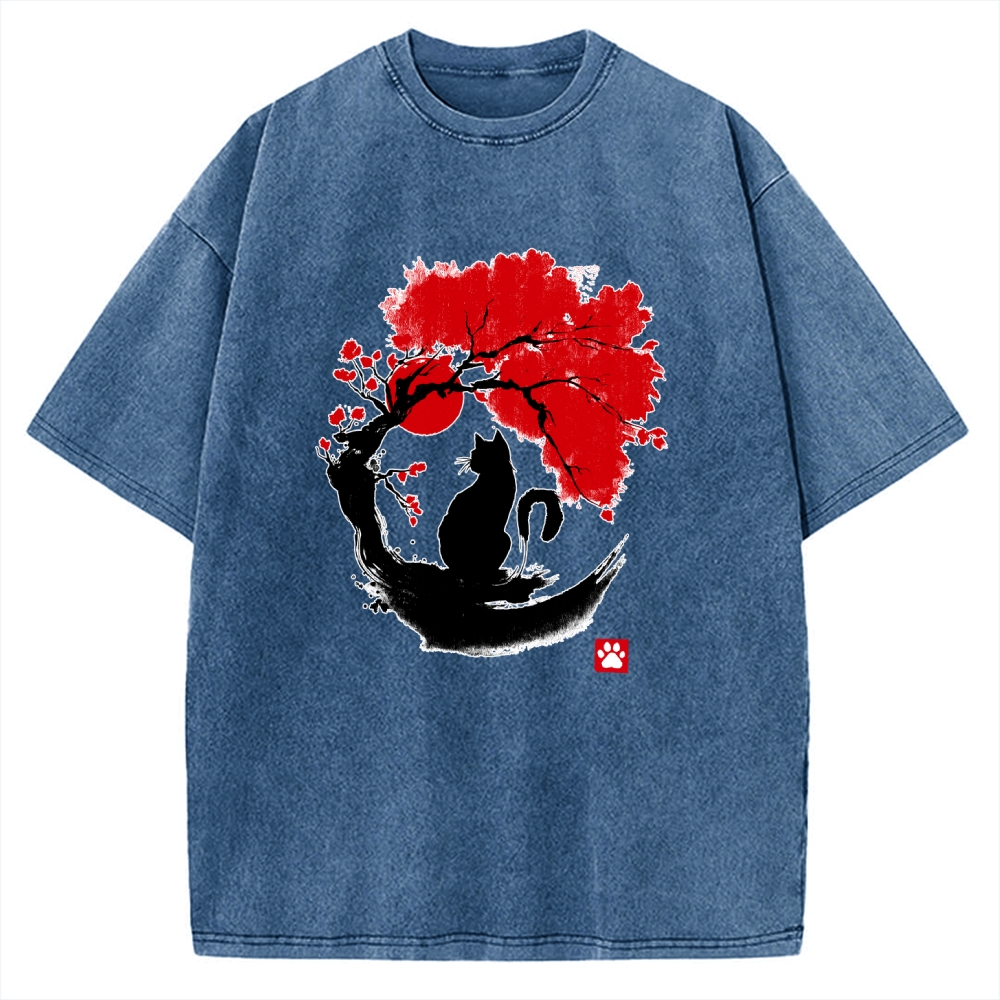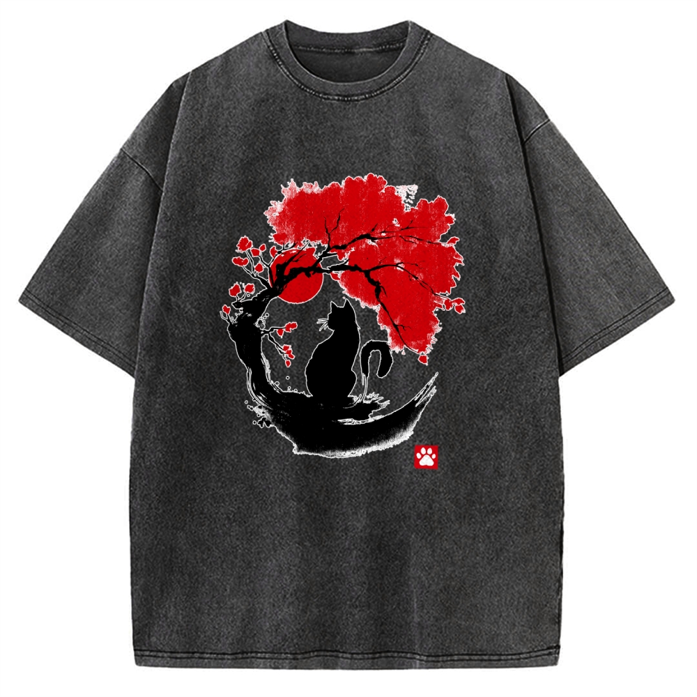 Black Cat Under Cherry Blossom Tree (Ink Painting) Vintage Washed T-shirt