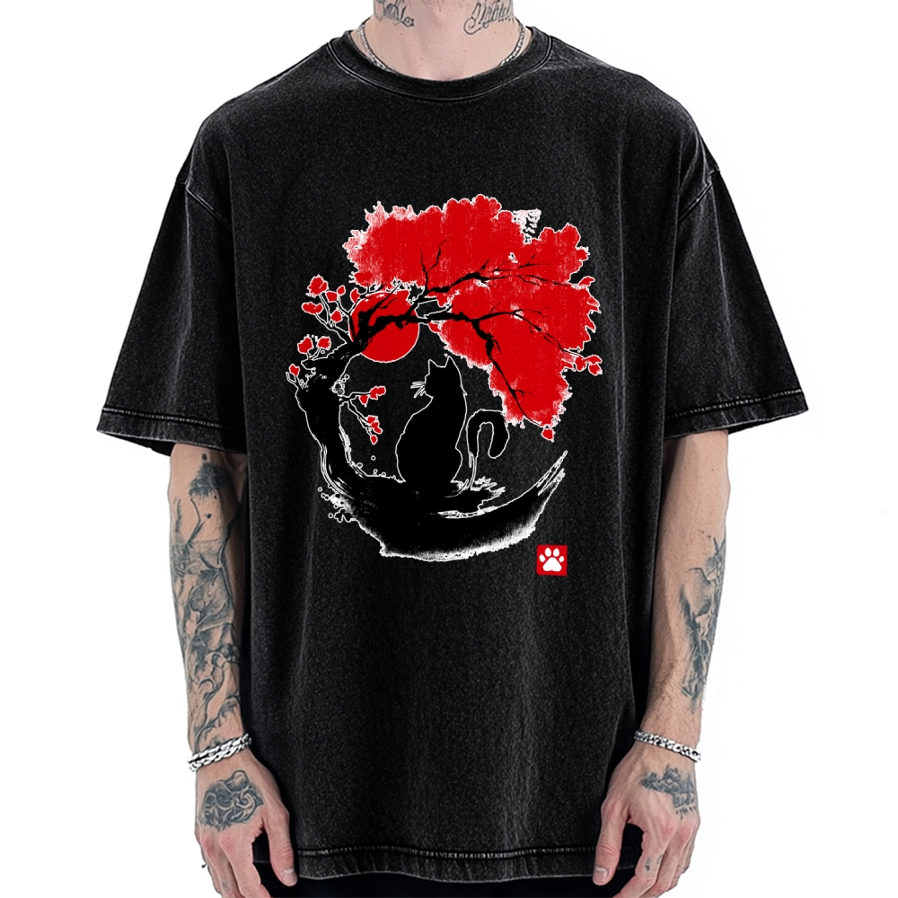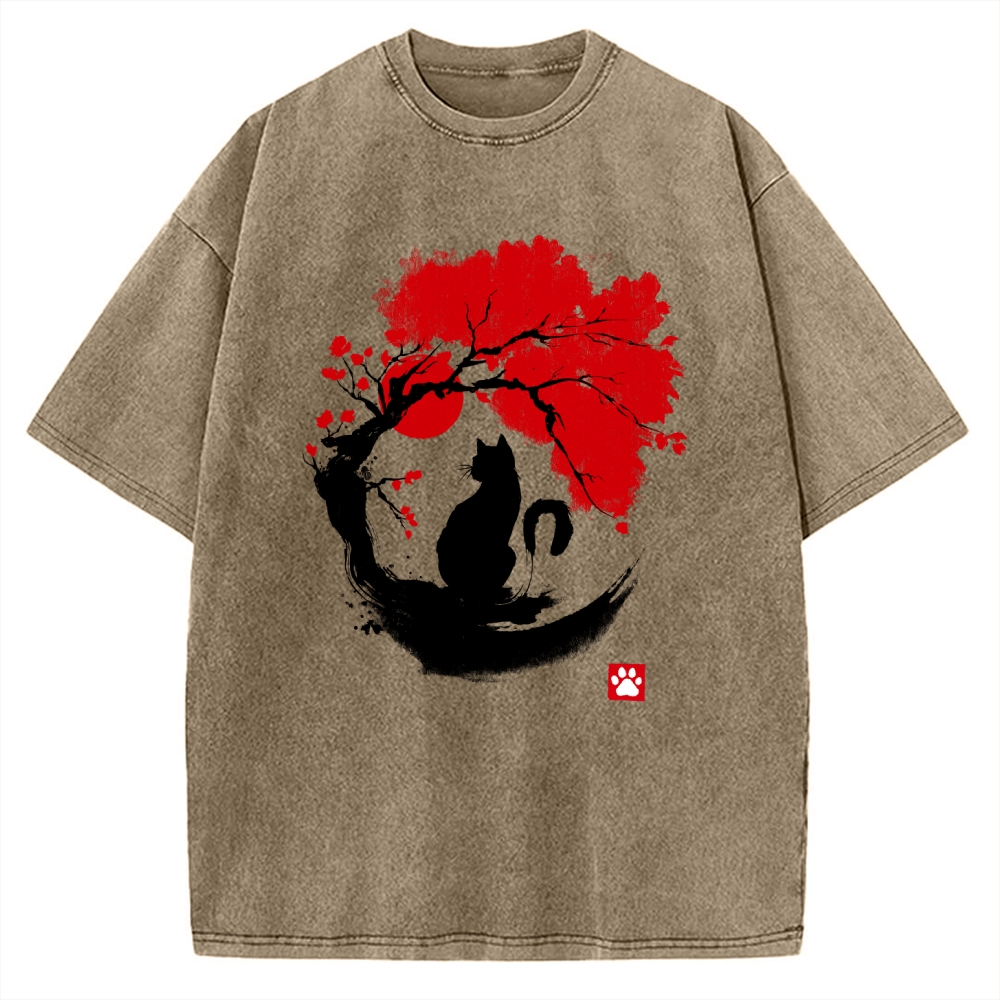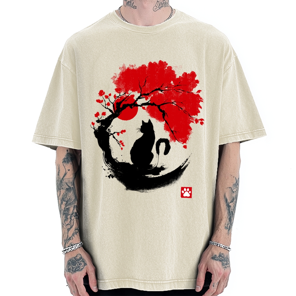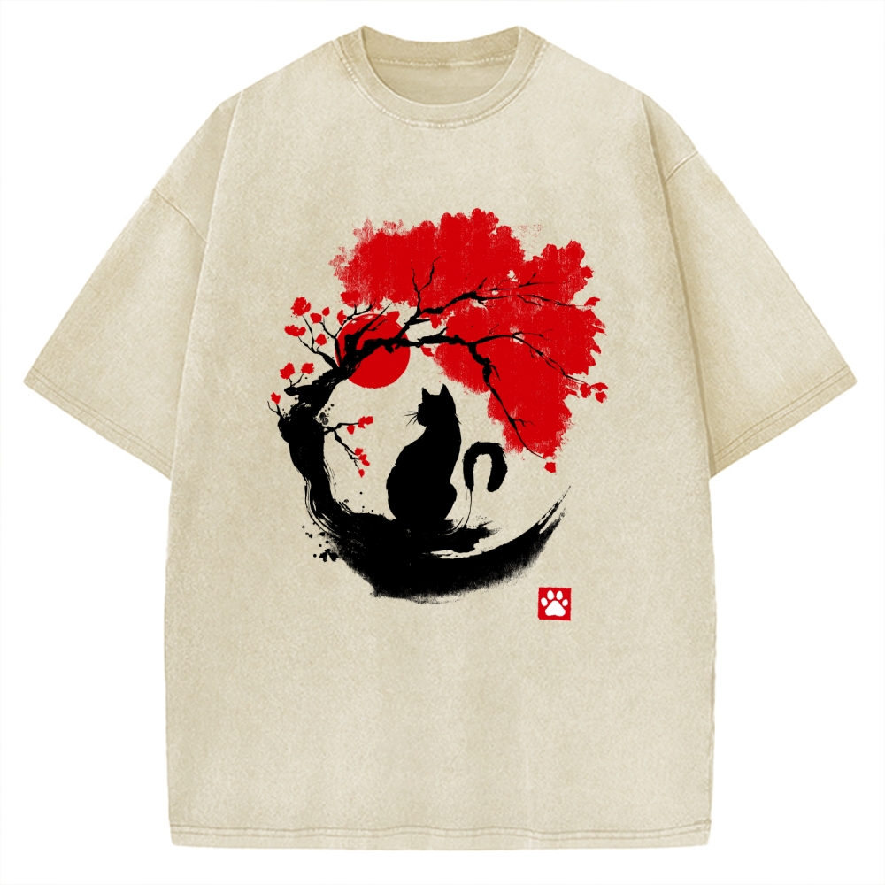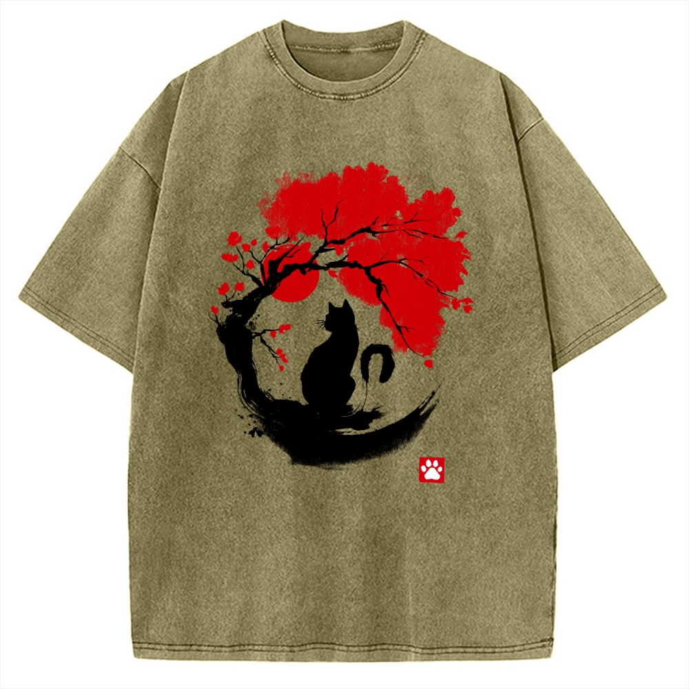 Black Cat Under Cherry Blossom Tree (Ink Painting) Vintage Washed T-shirt